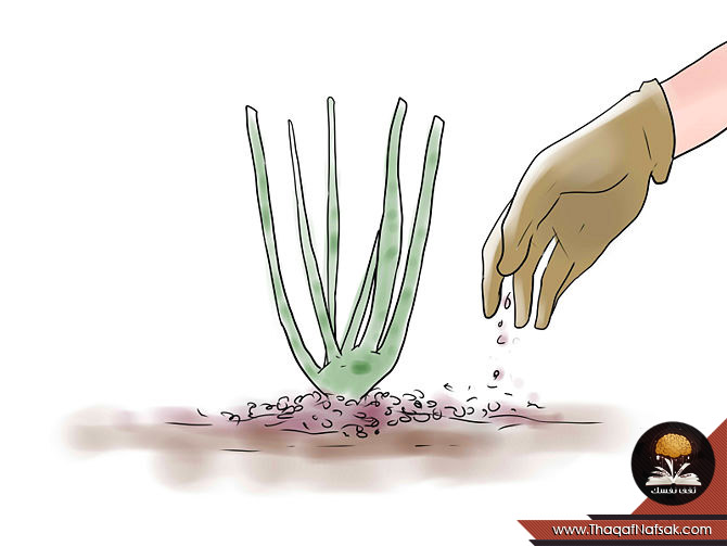 وضع الجذور العارية أو الجذور في وعاء في المنتصف وإستخدام مجرفة لملء الحفرة مرة أخري . يجب أن يكون الجذر تحت الأرض بمسافة 2 بوصة . و إذا كنت تعيش في منطقة أكثر برودة ، قد تحتاج إلي لزرع الورد الخاص بك بعمق أكثر لحمايتها من درجات الحرارة المنخفضة . إذا كنت تزرع الورد بالوعاء يفضل تخفيف التربة حول جذورها. تأكد من ثبات التربة حول الجذور ، و ذلك بالضغط بيديك لإزالة أي جيوب هواء موجودة . ري الورد : يساعد ري الورد علي تثبيت الجذور و تأكد من أن الماء غمر جميع أجزاء الزرع . إضافة النشارة : وضع النشارة علي المنطقة التي زرعت فيها الورد و إذا كنت زرعت شجرة بوعاء يفضل وضع النشارة حول الجذع . فهذا يساعد علي ثبات النبات أكثر و الحفاظ علي درجة حرارة التربة و حماية الورد في مرحلة النمو المبكرة . الطريقة من 3-4 رعاية الورد :يفضل ري الورد بالكثير من المياه في فصل الصيف . فالورود تحتاج إلي الكثير من الماء للحفاظ علي صحتها .لا تترك التربة حتي تجف تماماً . ري الورد علي فترات ثابتة و قد يعتمد ذلك علي المنطقة التي تعيش بداخلها ، قد تحتاج إلي القيام بذلك مرة واحدة في الإسبوع . تسميد الورد : بعد زراعتها ، يجب تخصيب التربة عدة مرات في مرحلة النمو . يمكنك إستخدام الأسمدة إما السائلة أو المحببة في أوائل الربيع و إذا رأيت الأوراق التي نبت قليلة ، يمكنك إستخدامها مرة أخري حتي تزدهر جيداً و يفضل وقف تخصيب التربة مع نهاية فصل الصيف .