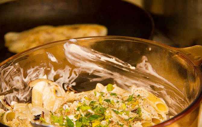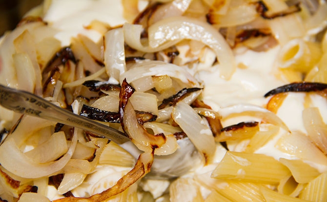 ثانيا الخطوات في طريقة عمل الباستا بالجبنه بالصور :1- قم بغلي الباستا بالطريقة المعتادة ثم قم بوضعها جانبا لتبرد 2- قم بخلط الزبادي والزبدة في وعاء آخر ثم قم بوضعها بالثلاجة حتى تبرد 3- قم بتشويح شرائح البصل لمدة دقيقة 4- وفي وعاء آخر قم بخلط كل من الباستا والزبادي وخلط الزبادي والكريمة والبصل معا