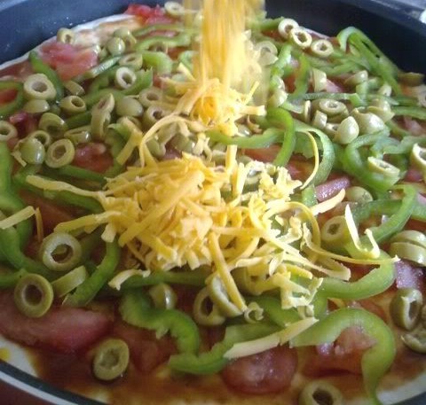 5- وضعي فوق العجينة صلصة البرجر والفلفل الرومي والزيتون والجبن الشيدر أيضا ثم ضعي معهم خلطة البورجر التي قمتي بإعدادها بالمقلاة وأخيرا رشي فوقها الجبن الموزاريللا ويمكنك إضافة شرائح الزيتون أيضا