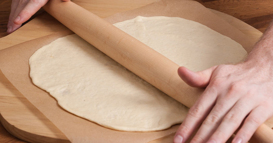 4- بعد مرور الساعة قومي بفرد العجينة في صينية – طريقة عمل بيتزا الروبيان