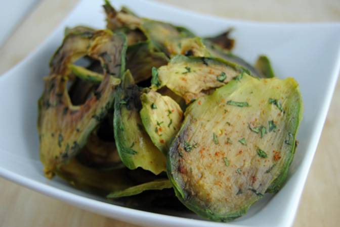 رقائق شبسي الأفاكادو : تقطيع الأفاكادو إلي شرائح رقيقة و رش فتات البانكو علي الرقائق المتموجة و بذلك فهي خفيفة و صحية . قم بإضافة كمية قليلة من الجبن قليل الدسم أعلي رقائق الأفاكادو لإضافة نكهة إلي الأفاكادو .
