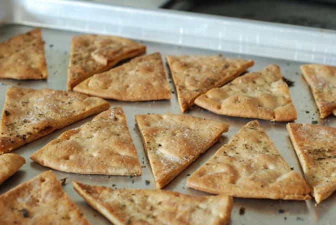 الرقائق المخبوزة : تقطيع خبز القمح إلي قطع مثلثة ، يضاف إليها الثوم المفروم و زيت الزيتون و الزعتر و الريحان و الملح و الفلفل و خلطهم جيداً . و الخبز في الفرن لمدة 5 دقائق في درجة 350 درجة . ترك الرقائق بضع الوقت بعد إزالتها من الفرن و تركها حتي تجف