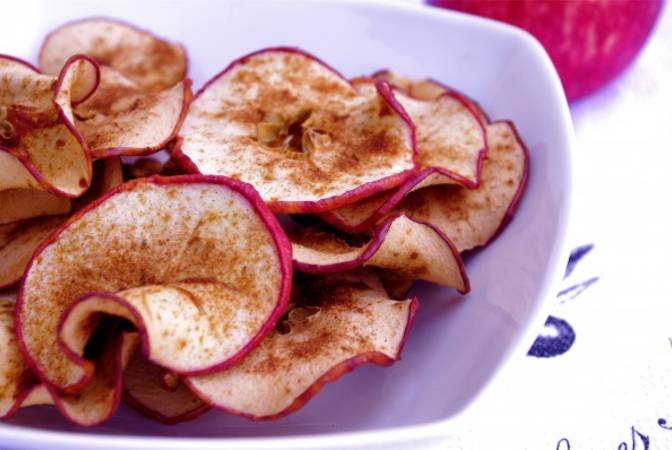 رقائق التفاح و القرفة : قد تبدو هذه الطريقة غريبة و مجنونة للغاية ، و لكن يمكنك أن تحول التفاح إلي وجبة خفيفة و ذلك بتقطيع التفاح إلي شرائح رقيقة و إضافة القليل من السكر الحبيبات و مسحوق القرفة . و الخبز في 200 درجة لمدة 30 دقيقة و تسوية كل جانب جيداً . يمكنك تركه لمدة 30 دقيقة إضافية للتبريد ، فهذه الوجبة خفيفة و مناسبة للطقس البارد .