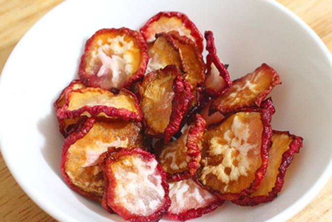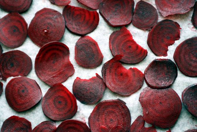 رقائق البنجر : يمتلك البنجر نكهة لذيذة للغاية و له طعم فريد للغاية . قم بتقطيع البنجر إلي شرائح رقيقة و إضافة الملح و الخبز مع زيت الكانولا. قم بإستخدام الزبادي فهو يعطي نكهة مميزة و يمكنك تناوله في العشاء .