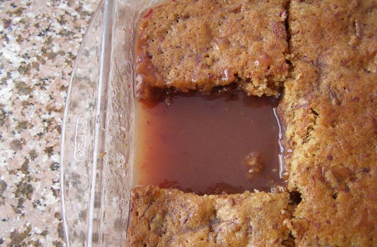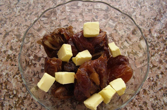 يتم إضافة الماء المغلي إلي التمر و الزبدة . ترك الماء المغلي علي التمر لفترة حوالي 15 دقيقة ثم هرس التمر بالشوكة ثم يضف الملح و جوز الطيب و القرفة و الهيل و الفانيليا . ثم وضع الدقيق في وعاء ، و إضافة بيكنج بودر و صودا الخبز و 1/3 كوب سكر بني و الجوز . يضاف التمر إلي خليط الدقيق و التقليب جيداً . صب الخليط في وعاء مدهون بالزيت . في وعاء أخر قم بوضع 1كوب سكر بني و 1/2 كوب ماء مغلي و صبه علي الكعكة من أعلي ، قم بتجربة هذه الخطوة و لا تستغرب فهي تعطي نتيجة هائلة . تسخين الفرن في درجة حرارة 180 درجة و تخبز في الفرن في الرف الأوسط لمدة 45 دقيقة ، قد تختلف الفترة الزمنية من فرن إلي أخر ستجد أن الماء الذي قمت بإضافته تحول إلي صوص تحت الكعكة . و عند تقطيع الكعكة و أخذ قطعة ستجد الصوص تحته . ملاحظة : يمكنك تقديم هذه الكيكة باردة أو دافئة فكلاهما له طعم لذيذ . لا يمكنك إخراج هذه الكعكة كاملة من المقلاة بل يتم تقطيعها إلي قطع صغيرة . يمكنك تقديمها مع القشدة و الكريمة . |