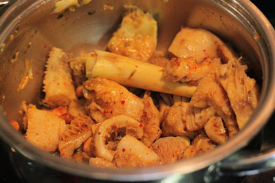 الخطوة الرابعة: قومي بإحماء الزيت ثم أضيفي إليه الثوم المفروم ويقلى حتى يكتسب اللون الذهبي ثم قومي بإضافة المزيد من قطع الطحال إليه واقليها لمدة 5 دقائق، ثم أضيفي المزيد من عشب الليمون والفول السوداني في الوعاء الأول واتركيه على الموقد ليطهو لمدة 30 دقيقة، وإذا نفد الماء يمكنك إضافة المزيد من الماء إلى الوعاء
