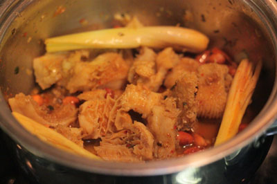 الخطوة الثانية: قومي بغلي الفول السوداني ثم قشريه وإذا استخدمت الفول السوداني الجاف فيجب أن تقومي بنقعه لمدة ليلة كاملة قبل غليه، ثم نظفي عشب الليمون وقطعيه إلى شرائح الخطوة الثالثة: قومي بتنظيف الفلفل الأخضر جيدا وقطعيه إلى قطع صغيرة ثم قطعي الطحال إلى مكعبات صغيرة، وأضيفي إليه النكهات المختلفة والفلفل الأخضر والثوم المفروم وملعقة صغيرة من صلصة السمك وملعقة صغيرة من السكر وقلبيهم جيدا وانتظري لمدة 30 دقيقة.