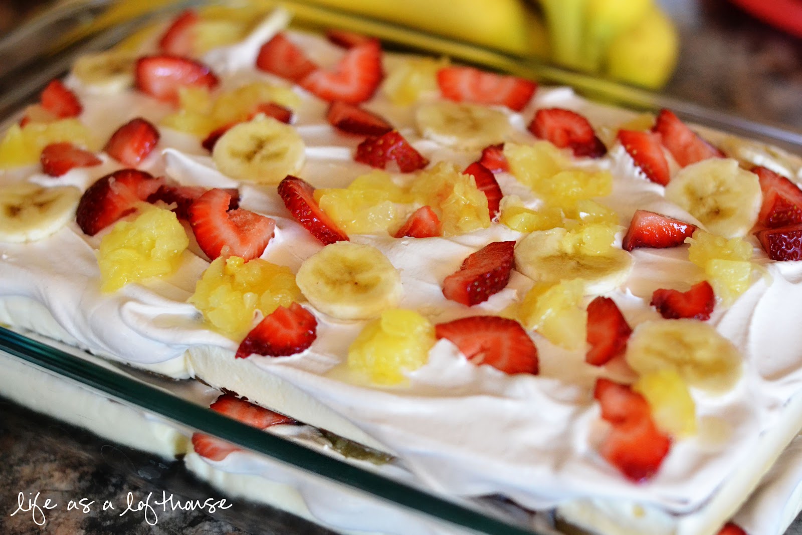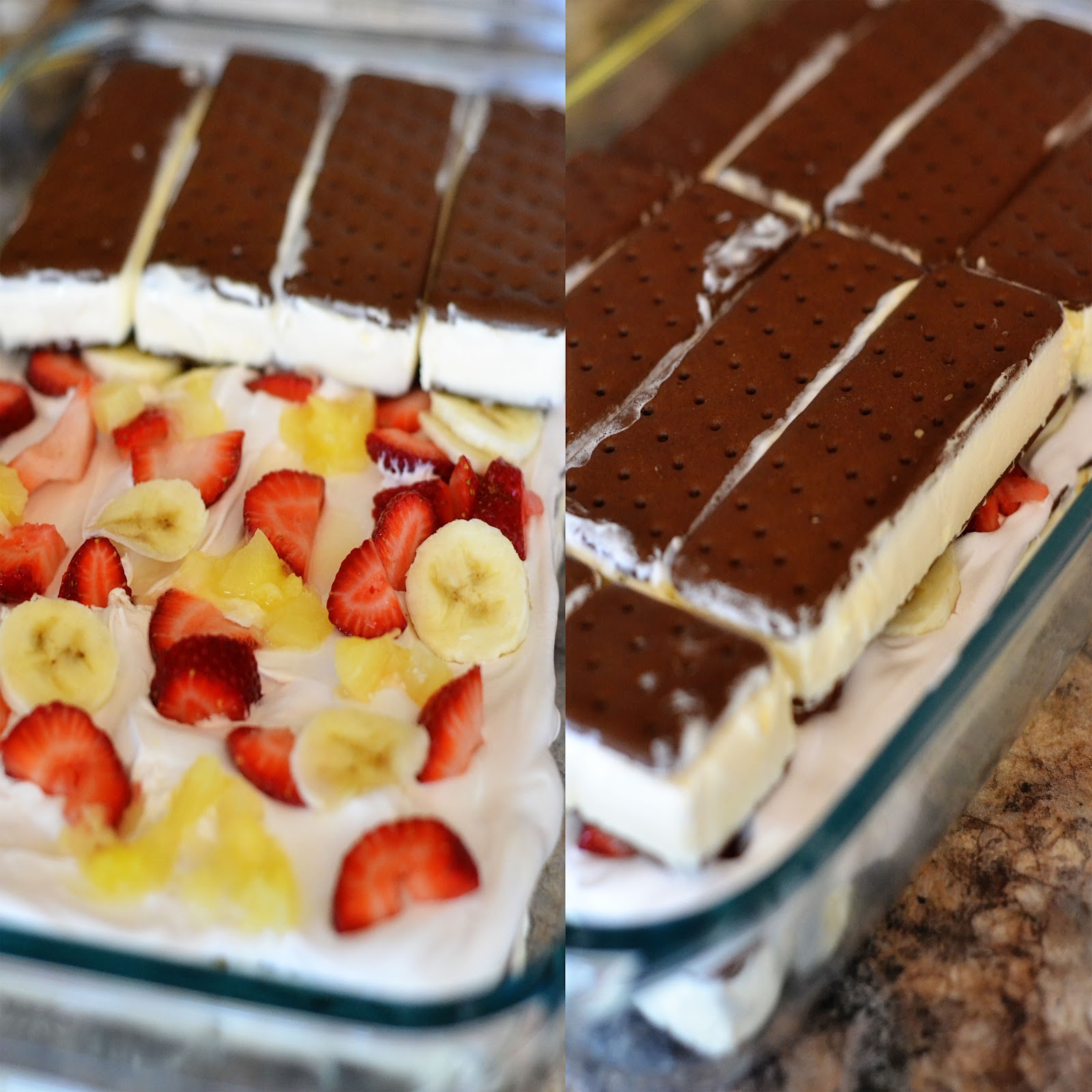 -وقوموا بتكملة وضع باقية الآيس كريم ساندويتش واضغطوا برفق فوقها، ثم ضعوا فوقها المتبقى من مزيج الكريمة ، وبعدها باقى الفواكه، ثم غطوها وجمدوها فى الفريزر من 6-8 ساعات، او اتركوها طوال الليل.