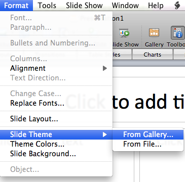 12- وإذا أردت ان ترى شكل العرض التقديمي الخاص بك من البداية اضغط على اضغط علىfrom beginning ثانيا: طريقة إنشاء عرض تقديمي بالبوربوينت على نظام التشغيل ماك Mac 1- قم بفتح برنامج البوربوينت 2- قم إنشاء اول شريحة ويمكنك استخدام القوالب الموجودة بالبرنامج وقم بتنسيق الشريحة من خلال تخطيط الشريحة slide layout الموجود بشريط الأدوات حيث يمكنك من خلالها اختيار شريحة لتضيف بها العناوين والنصوص والصور والرسوم البيانية وما إلى ذلك. 3- ثم قم بإضافة شريحة جديدة عن طريق أيقونة الشريحة الجديدة أو من خلال إدراج Insert ثم شريحة جديدة New Slide 4- ثم قم بإضافة المحتوى الذي تريده للشريحة سواء نص أو صورة أو رسم بياني ويمكنك عمل ذلك أيضا من خلال إدراج Insert 5- وكما ذكرنا قبل ذلك فيمكنك إضافة المحتوى الذي تريده من خلال اختيار تحديد الشريحة الذي تريده 6- كما يمكنك تغيير خلفية الشريحة عن طريق Slide Theme أو من خلال اختيار تنسيق format ثم Slide Theme ثالثا: طريقة القوالب بالنسبة للكمبيوتر العادي (القديمة) - افتح البرنامج وابدأ بنموج أو قالب معين تختاره - تصفح الشرائح والأشكالك لها حتى تصل إلى الشكل الذي تريده، حيث يمكنك مضاعفة الشرائح أو تغيير التنسيق من خلال اختيار تخطيط الشريحة وإضافة شرائح جديدة وتنسيق وترتيب الشرائح. - ثم ابدأ في إضافة المحتوى الذي تريده بالشرائح، وعليك هنا أن تقوم بإضافة المعلومات الهامة فقط والتي تفيد العرض التقديمي فقط ولا تصهب في سرد معلومات غير هامة تشتت انتباه المتابعين لك. - لأضافة رسم بياني أو جدول او صورة اضغط على الأيقونة الخاصة به في شريط الأدوات العلوي - حاول ان تقوم باختبار شكل العرض التقديمي الخاص بك من خلال view ثم عرض الشرائح slide show أو من لوحة المفاتيح من خلال الضغط على مفتاح F5