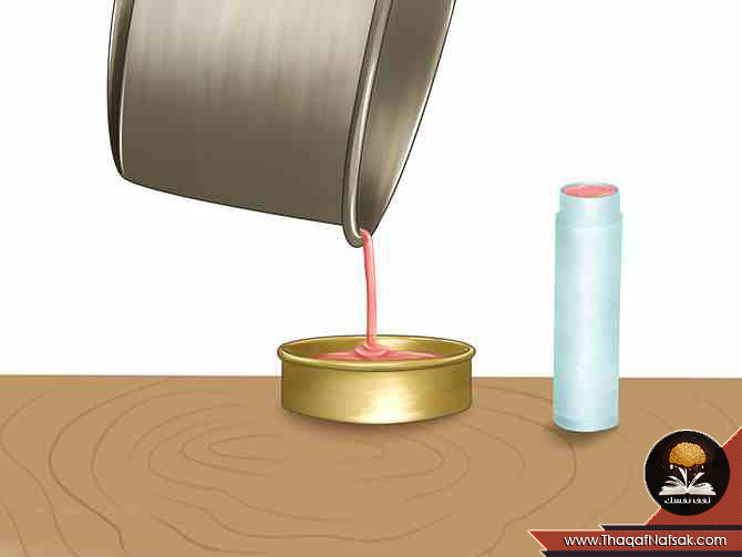 5. صب الخليط في وعاء و السكب في بعناية في الوعاء أو الأنبوب . سوف تحتاج إلي غسل الوعاء قبل أن يتصلب الملمع . 6. تركه لفتره : تركه لفترة لمدة 2 ساعة أو ليلة كاملة قبل إستخدامه ، حتي يبرد تماما . طريقة ملمع الشفاه الوردي : 1. جمع المكونات اللازمة للقيام به