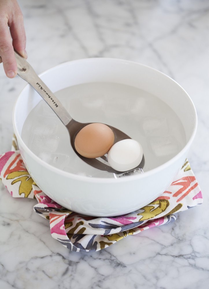 6- ثم قم بوضع البيض في وعاء من الماء المثلج واتركه به لمدة لا تقل عن دقيقة ثم ارفعه