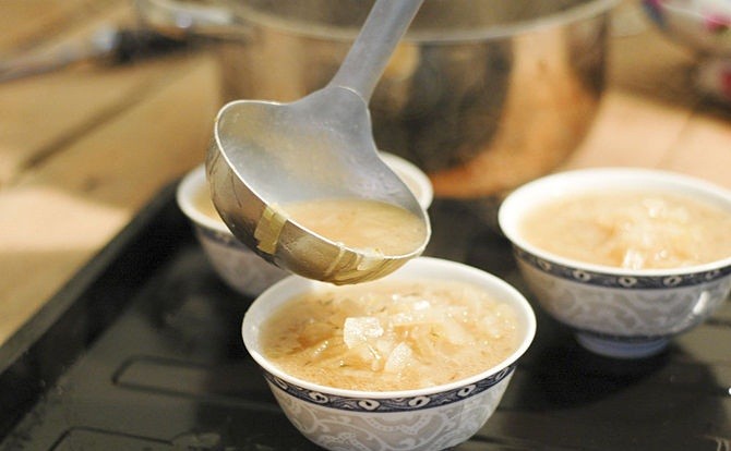 الجزء الأول من الخطوات : تجهيز الخبز المحمص : قومي بتقطيع الخبز الفرنسي إلي شرائح صغيرة الحجم لأنها تصبح أكبر و أكثر هشة عندما يبرد . سخني الفرن في درجة حرارة 350 درجة فهرنهايت ، مع دهن صنية الخبز بالرذاذ الغير لاصق . قومي بدهن جوانب كل شريحة من الخبز الفرنسي بالزيت . وضعي كل شرائح الخبز الفرنسي الموجودة معك في الفرن لمدة دقيقة واحدة . إرفعي صنية الخبز من الفرن ، و إتركي الخبز المحمص الفرنسي حتي يبرد . الجزء الثاني من الخطوات ، تجهيز الحساء : قومي بوضع الزيت في المقلاة علي درجة الحرارة . ضفي شرائح البصل للمقلاة حتي يتم طهيهم و تتحول إلي اللون البني و تصبح لينة أكثر قد يستغرق ذلك 20 دقيقة من التقليب . صبي الماء في مقلاة البصل و اتركي الماء حتي يغلي . بعد ذلك قومي بصب حساء الميسو و الزعتر و الخلط بينهم جيداً بالمعلقة مع تقليل درجة الحرارة حتي يغلي الحساء .قومي بتذوق الحساء لإضافة الملح و الفلفل و التوابل الأخري حسب التذوق . مع مواصلة وضع المكونات علي نار هادئة . الجزء الثالث من الخطوات ، تقديم الحساء : قومي بضبط درجة حرارة المشواء . جهزي أربع أطباق تقديم الحساء لصب الخليط بداخلهم . صبي خليط الحساء في الأطباق بالتساوي بينهم . قومي بوضع الخبز المحمص علي رأس كل طبق . مع رش شرائح الجبن النباتي علي الخبز المحمص . قومي بوضع أطباق الحساء في الشواء . إنتظري حتي يتحول لون الجبن إلي اللون البني و يبدأ الحساء في الغليان . و الأن قومي بإزالة الأطباق من الفرن ، و تقديمها علي الفور . ملاحظة : يمكنك الحصول علي حساء الميسو من متاجر الأغذية الصينية . لماذا قمنا بإختيار هذه الوصفة لكم اليوم ؟ نوصي بتناول حساء البصل لأنه مفيد للغاية و عادة ما ينصح بتناولها لعلاج الحمي و نزلات البرد بالإضافة إلي أن له فوائد اخري صحية للجسم . و من فوائد حساء البصل الصحية ما يلي : مضاد للبكتريا : عادة ما يكون للبصل نكهة لاذعة و رائحة قوية . و هذا ما يجعله الحساء الأفضل بالنسبة لمعظم الناس أو يجعل البعض تجنبه . و مع ذلك فهو مضاد جيد للجراثيم و عند تناوله بإنتظام في نظامك الغذائي يساعدك في زيادة تحسين المقاومة الطبيعية للبكتريا . و يقلل من الإصابة من أنواع مختلفة من العدوي . يمد الجسم بحمض الفوليك : يساعد حمض الفوليك الجسم في تنظيم أداء أجهزته الأساسية .و عادة ما يوجد في الفواكه المختلفة ، مع ذلك فإن البصل يحتوي علي كمية عالية من حمض الفوليك و لتحقيق أفضل إستفادة ينصح بتناول حساء البصل . الحصول علي الفيتامينات : يعد حساء البصل مصدر جيد للفيتامينات مثل فيتامين أ ، هـ ، ج و جميع هذه الفيتامينات لازمة للعمليات الحيوية الأساسية للجسم. حيث يعمل فيتامين ج علي تحسين الجهاز المناعي .. و ينصح الأفراد الذين خضعوا لعملية جراحية بتناول حساء البصل لتعزيز الصحة و الشفاء العاجل . تحتوي علي نسبة عالية من الحديد : يحتوي البصل علي نسبة عالية من الحديد و بذلك فهو يحمي الجسم من فقر الدم ويساعد في بناء خلايا دم صحية .